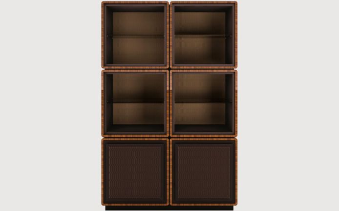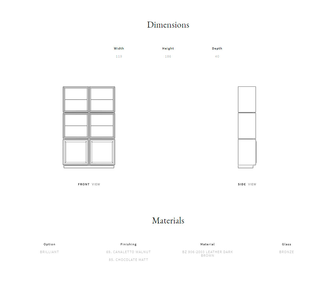 Solid wood and plywood structure. Outer structure available in lacquered wood or canaletto walnut veneer. Lacquered wood inner structure. Quilted alcantara back panel. Crystal shelves, bronze colour.