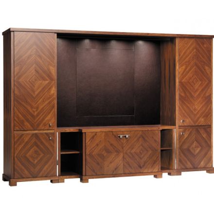 A wooden composition consisting of 2 Newloti bookshelves and a Chester cabinet, a leather back panel, a central top shelf, 4 halogen spotlights and steel parts.