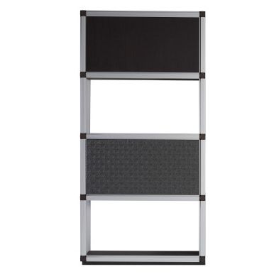 Anodized aluminium bookcase/showcase, n. 2/4 sand walnut or tobacco oak units, n. 2/4 open compartments, walnut details. Other frontal finishings are marble or dark grey woven leather.