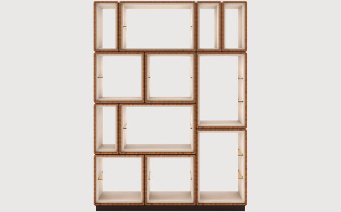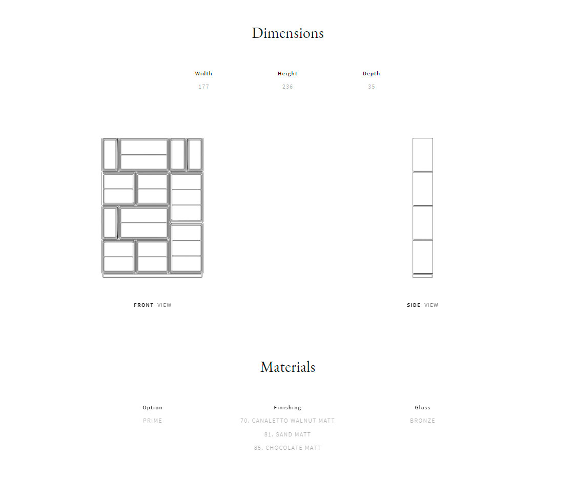 Solid wood and plywood structure. Outer structure available in lacquered wood or canaletto walnut veneer. Lacquered wood inner structure. Crystal shelves, bronze colour.
