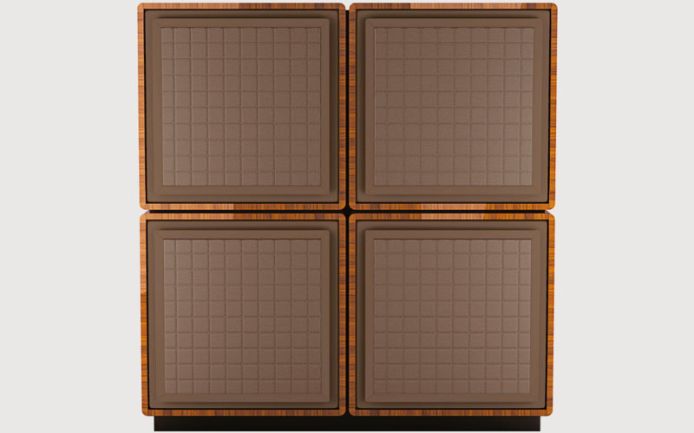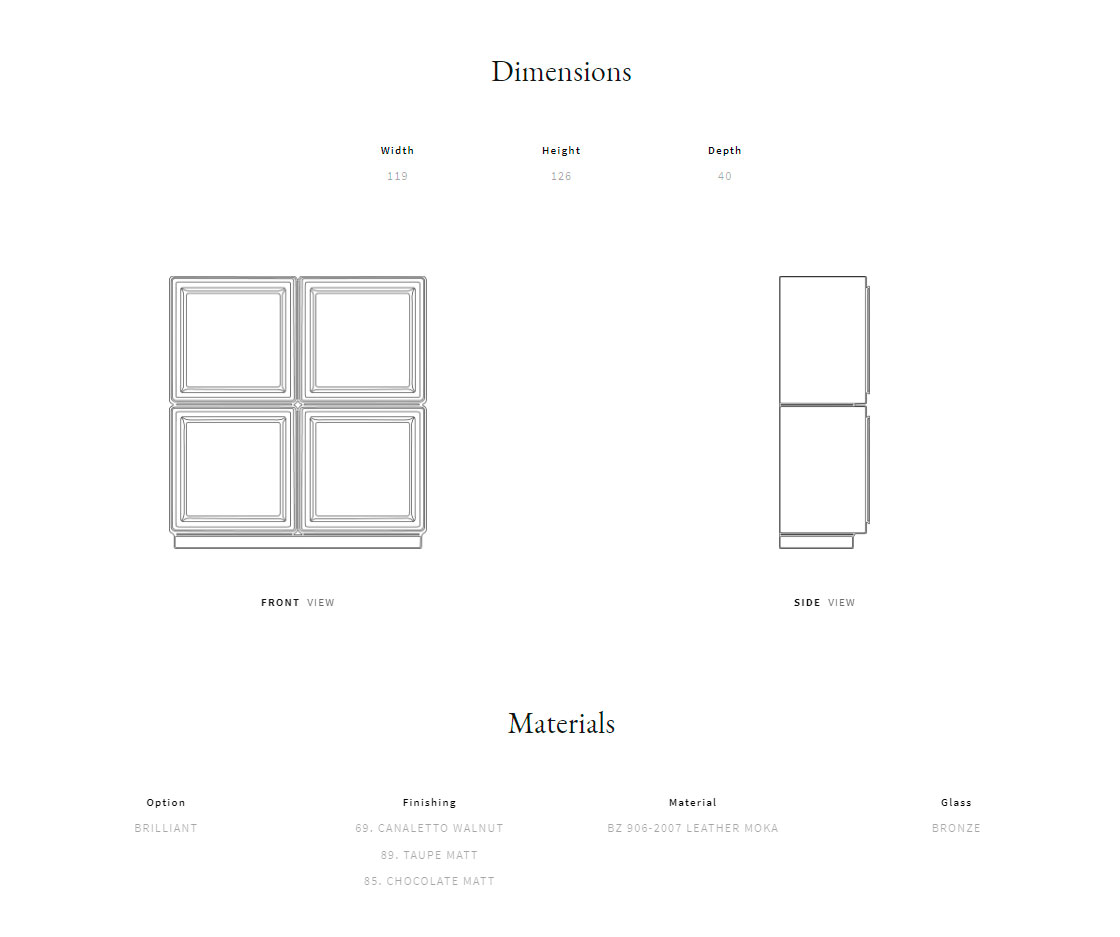 Solid wood and plywood structure. Outer structure available in lacquered wood or canaletto walnut veneer. Lacquered wood inner structure. Quilted alcantara back panel.