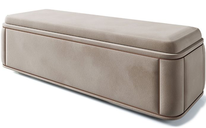 Padded bench with leather or fabric cushion, with a wooden frame covered in leather or fabric, matching the Ripley bed. Internal structure made of solid wood blocks and plywood, internal compartment.