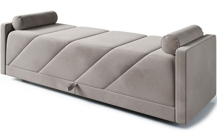Padded bench upholstered in leather or fabric. Plywood frame and seat consisting of a polyurethane cushion and acrylic skirt, with a quilted top. Seat can be opened to reveal an internal storage compartment, fully lined in microfiber. Padded rolls included.
