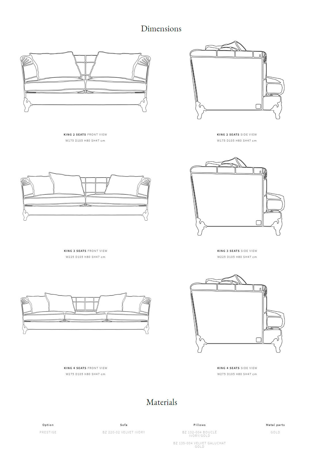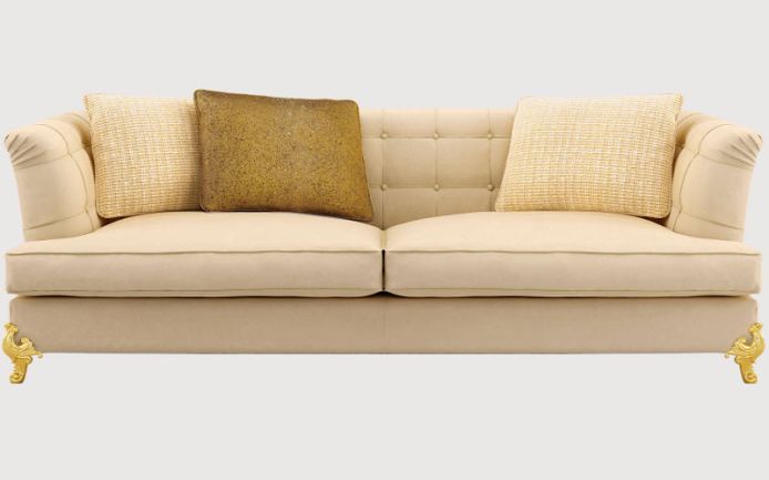 Solid wood frame; brass feet. Quilted inner body with buttons. Seat cushions in natural feather with polyurethane insert. Bed mechanism not available.