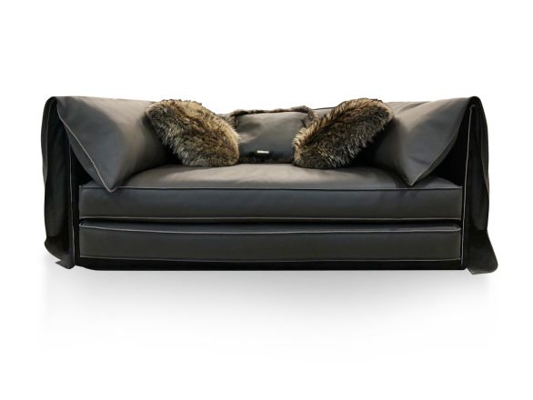 Structure in poplar wood and foam. Upholstery in leather Piumone Mokaccino. Cushions in fabric with RC logo application and Racoon