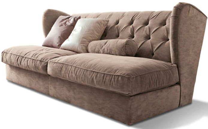 Fixed sofa w/buttoned back and pillows w/down fillings. Seats cushions in polyurethane foam Wrapped in down.