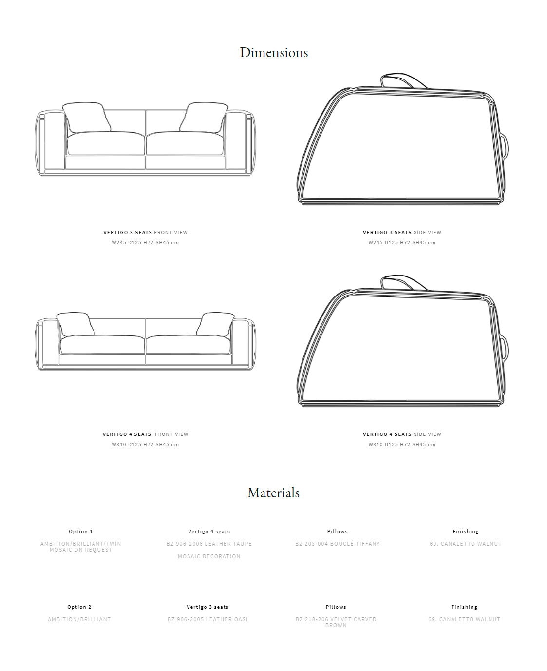 Solid wood structure; canaletto walnut wooden frames. Quilted backrest. Seat cushions in natural feather with polyurethane insert. External armrests in quilted leather (alternatively with mosaic on request). Bed mechanism not available.