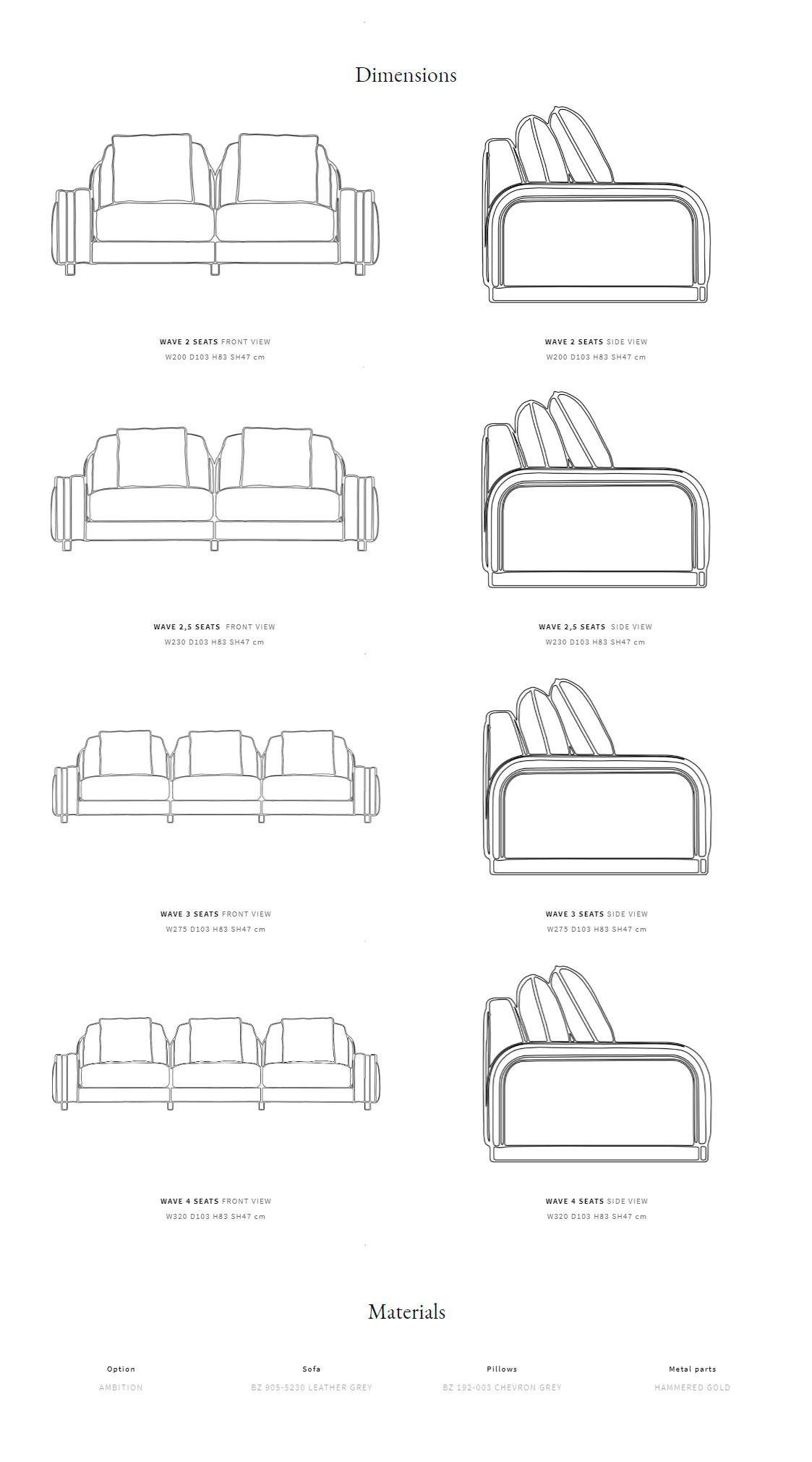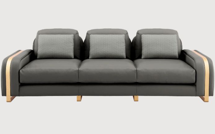 Solid wood frame. Feet and armrests decoration in hammered gold metal. Leather decoration on outer armrests. Seat and back cushions in natural feather with polyurethane insert. Bed mechanism not available.