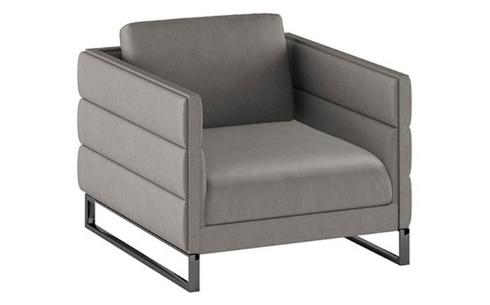 A stationary upholstered armchair with seat and back cushions with removable covers, 2 rectangular pillows with a steel edge and legs.