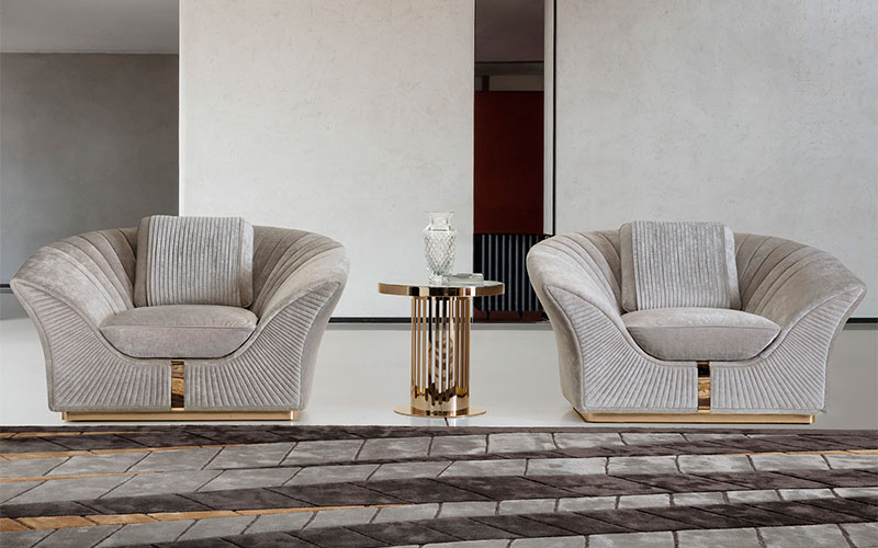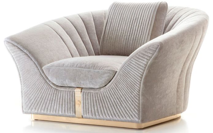 Sofa armchair with quilted fronts available in first grade leather, nubuk leather, lizard printed leather, velvet or suede fabric. Seat and sides in polyurethane foam wrapped in down feather. Pillow with leather trim. 1 big back pillow and base + frontal insert in light gold chrome stainless steel with Giorgio Collection logo.
