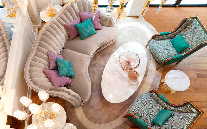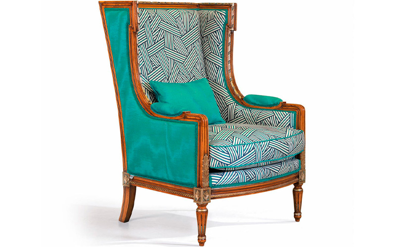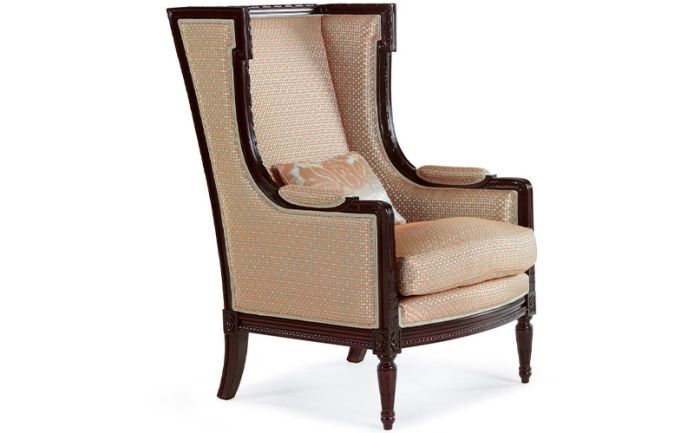 Classic handcrafted armchair with high backrest, wooden frame, fabric upholstery and decorative cushion.