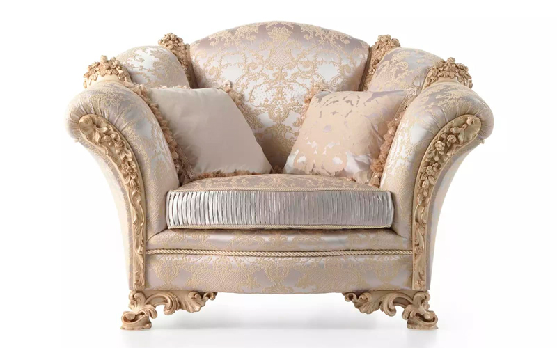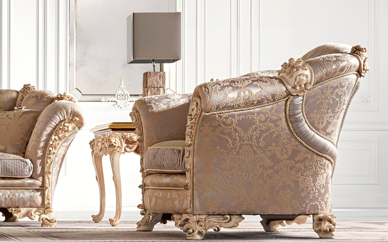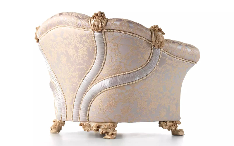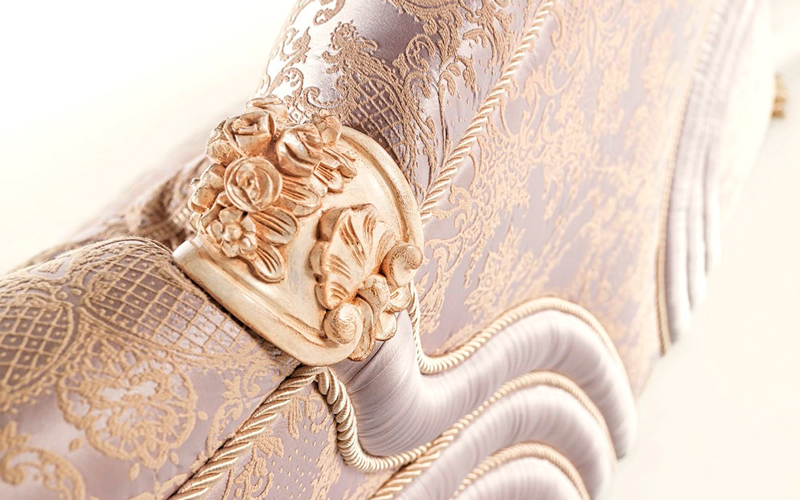 Elysée line is characterized by wood carvings on the armrests and on the back. The trimming embellishes the set, making these pieces the absolute protagonists of the setting in which they are inserted. The sophistication and refinement is enhanced by the subtle grace of the fabric with embroidery in relief. The delicate color palette creates a unique and timeless atmosphere where to live the intimate essence of Jumbo Collection’ style.