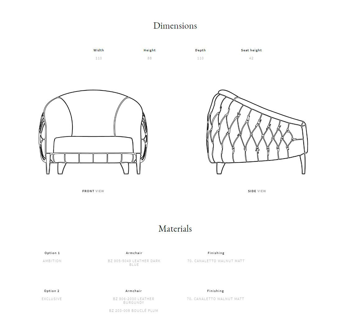 Solid wood frame; canaletto walnut wooden feet. Capitonné outer body. Multiple densities polyurethane foam seating.
