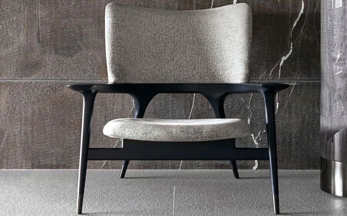 Occasional chair available in first grade leather, nubuk leather, lizard printed leather, velvet or suede fabric. Structure in solid stained black bleached wood. Wooden base wich Giorgio Collection logo.