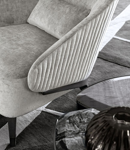 Occasional chair available in first grade leather, nubuk leather, lizard printed leather, velvet or suede fabric. Chair seat and sides with double stitching in polyurethane foam wrapped in down feather. Back in quilted fìnish. Wooden base with Giorgio Collection logo. 4 legs with details in satin black nickel stainless steel.