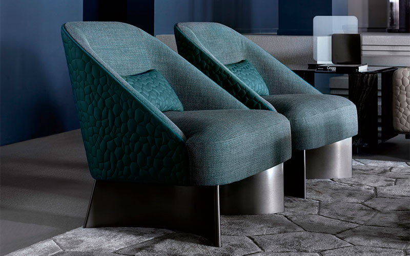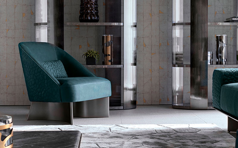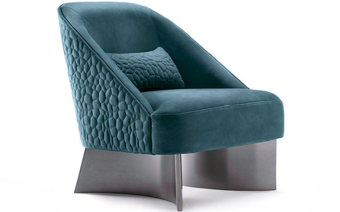 Occasional chair available in first grade leather, nubuk leather, lizard printed leather, velvet or suede fabric with back pillow (size: cm 45W x 22D x 6TH). Chair seat and sides with special stitching in polyurethane foam wrapped in down feather. Back in hexagonal quilted finish. 2 legs in satin black nickel stainless steel.