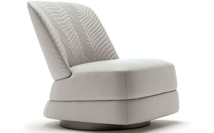 Occasional swivel chair available in first grade leather, nubuk leather, lizard printed leather, velvet or suede fabric. Chair seat and sides with double stitching in polyurethane foam wrapped in down feather. Quilted back with embroidered Giorgio Collection logo on the base.