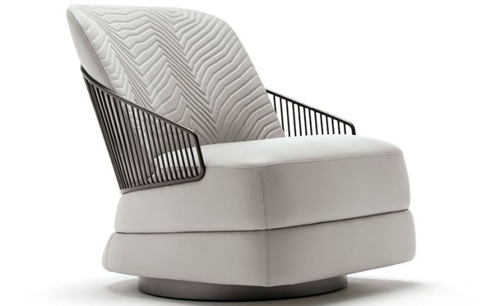 Occasional swivel chair available in first grade leather, nubuk leather, lizard printed leather, velvet or suede fabric. Chair seat and sides with double stitching in polyurethane foam wrapped in down feather. Quilted back with satin grey nickel stainless steel structure with embroidered Giorgio Collection logo on the base.