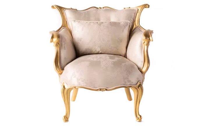 Regency is an elegant and comfortable armchair, whose name refers to the English style in vogue in the period that goes from the last years of the eighteenth century to around 1840 and which is characterized by the use of shapes and motifs that refer to the ancient world and to the Orient. The armchair features a hand-carved structure with a gold leaf finish and a delicate fabric upholstery.