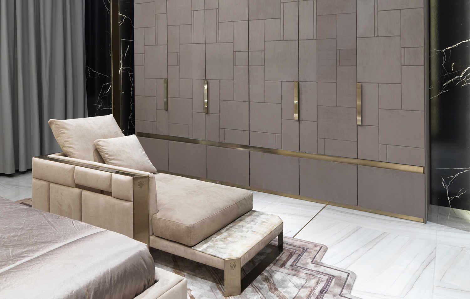 Wooden and metal structure with spring system with straps; padding in polyurethane foam in different densities. Seat cushion in polyurethane, Memory Foam® and goose down. Loose cushions in feather.