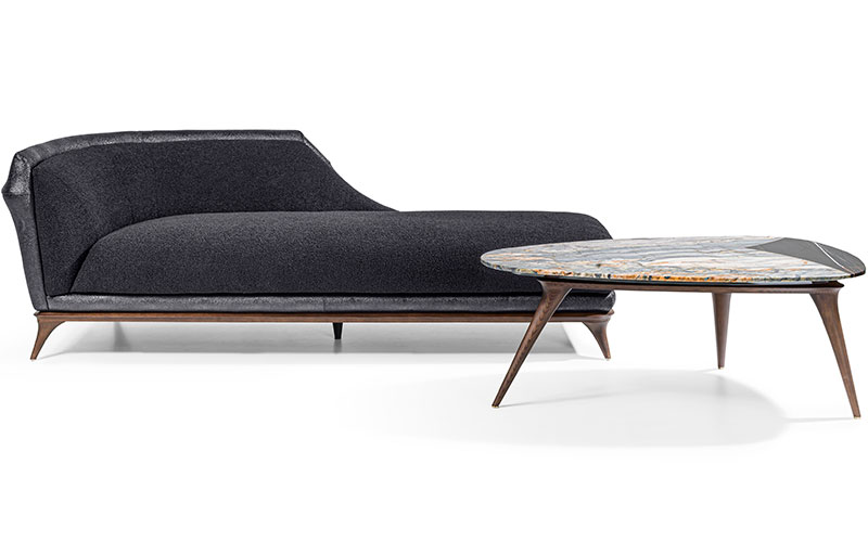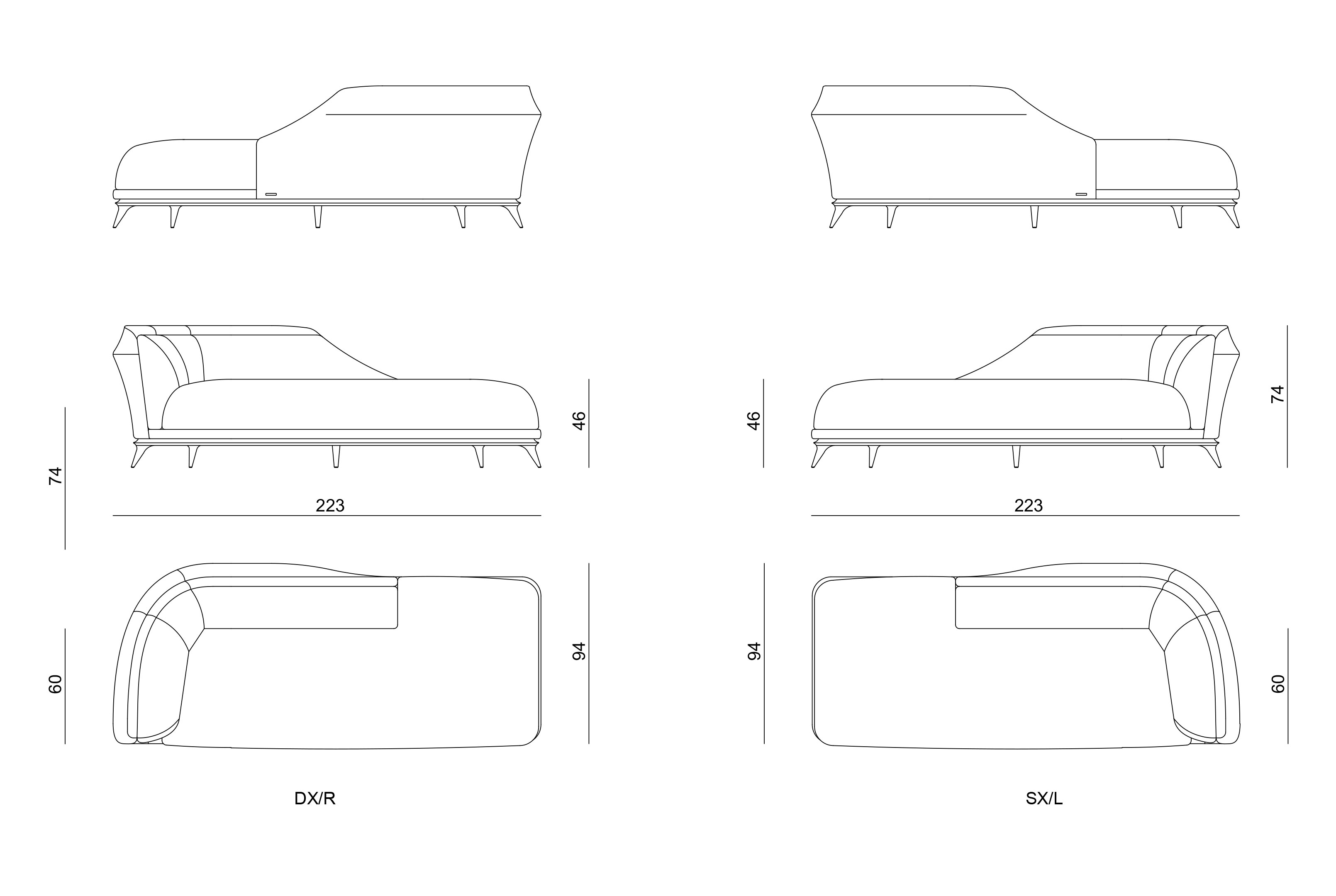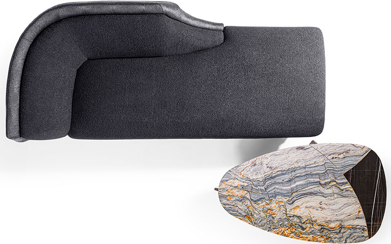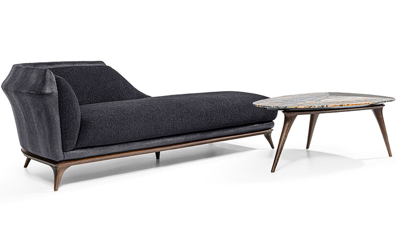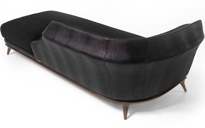 Dormeuse upholstered in leather or fabric. Curved and shaped frame in solid and multiply wood, externally covered in rigid shaped polyurethane with concave and curved external surfaces.