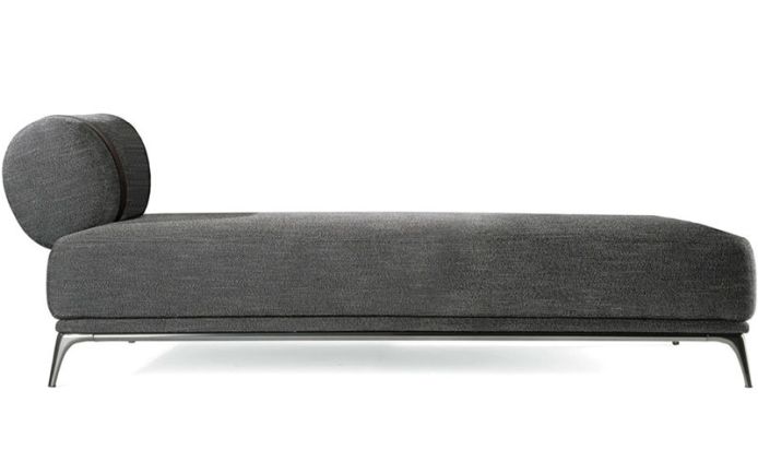 The daybed - new entry of the Phoenix line - conquers with its essential lines and vintage charm. Featuring an armrest with oval inclined section and retro-style feet with black chrome finishing, it is upholstered in dark grey fabric and embellished with decorative belts.
