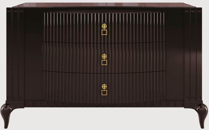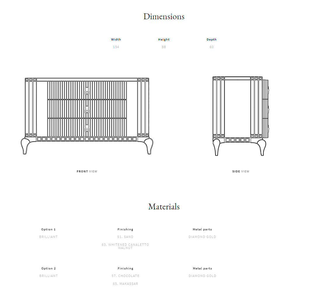 Solid wood and plywood structure. Hand-carved wooden feet. Top available in canaletto walnut veneer, makassar ebony veneer or marble. Brass handles.