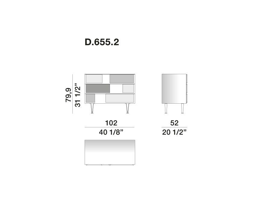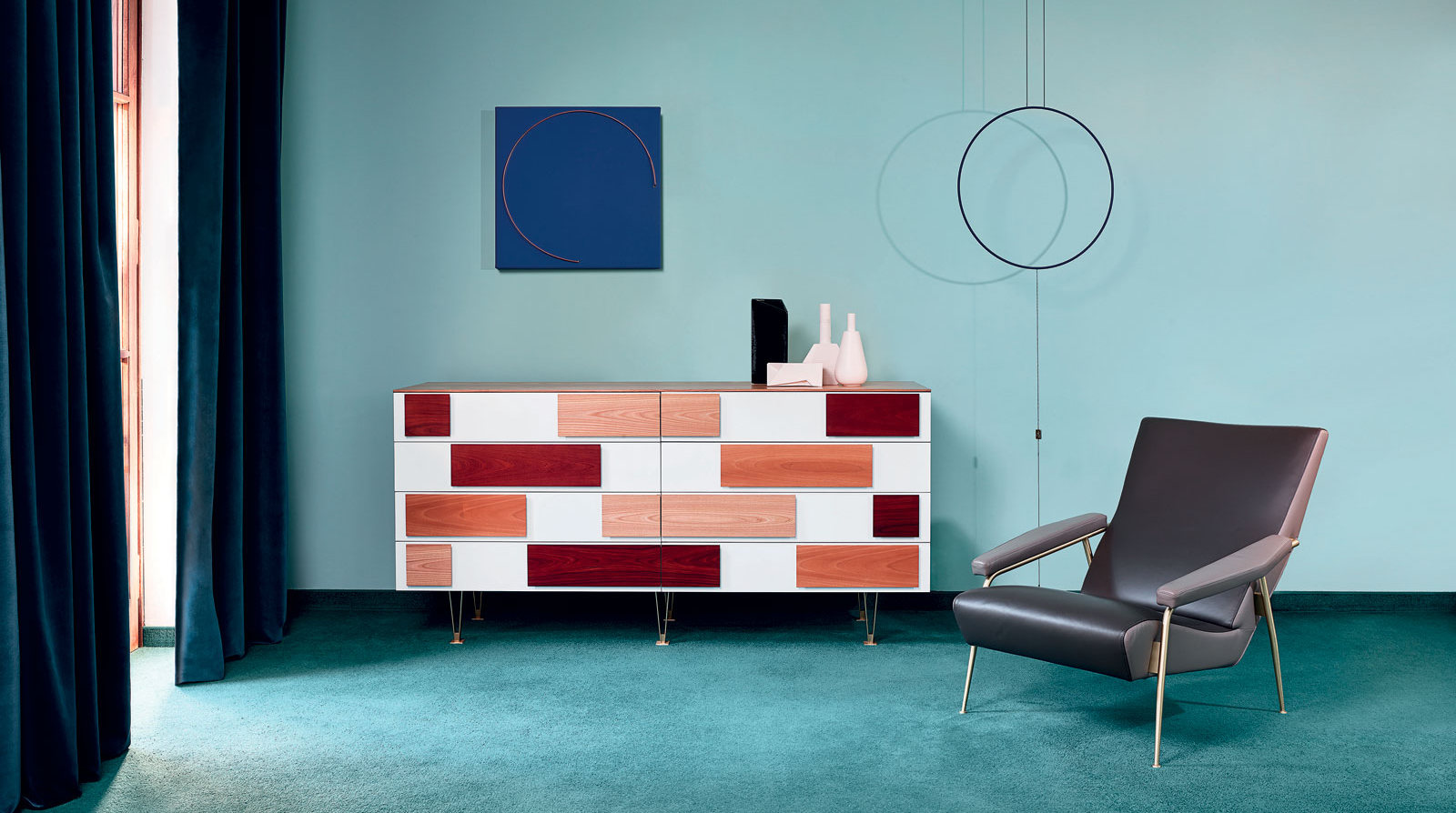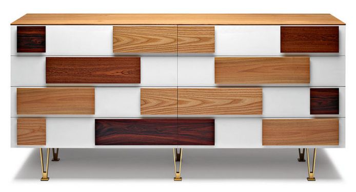 It is distinguished by hand-painted white facades of drawers with handles made of various types of wood (elm, Italian walnut, mahogany and rosewood).