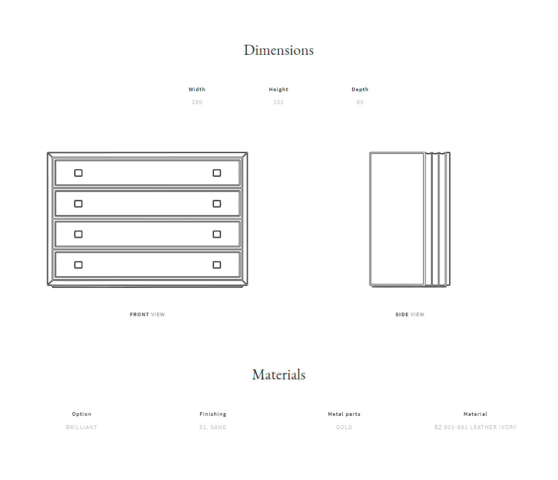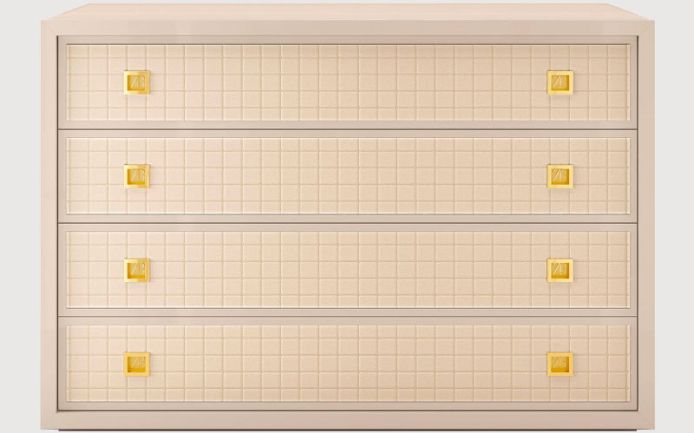 Solid wood and plywood structure. Quilted leather front drawers. Brass handles.
