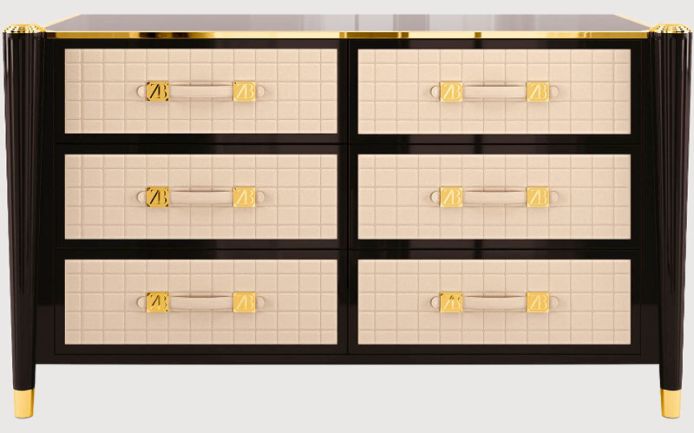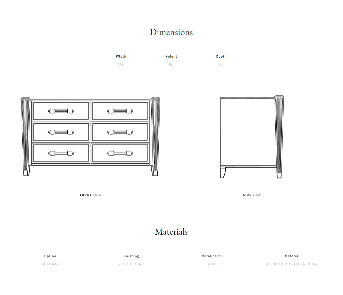Solid wood, plywood and MDF structure. Lacquered wooden top. Quilted leather side parts and drawers. Brass handles and details. Wooden columns with fluted decorations.