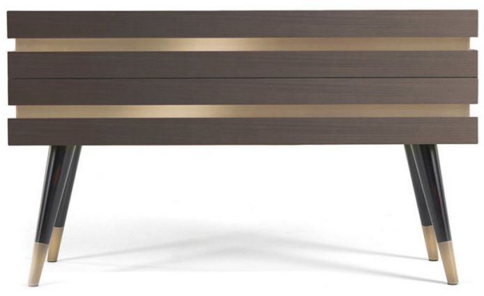 Dettagli in legno scuro e bronzo spazzolato: una combinazione sofisticata che ricorda lo spirito delle mazze da golf inglesi e il fascino sofisticato delle lounge aristocratiche. Si distingue per la presenza di gambe inclinate che conferiscono a tutto il fascino dello stile della metà del secolo.