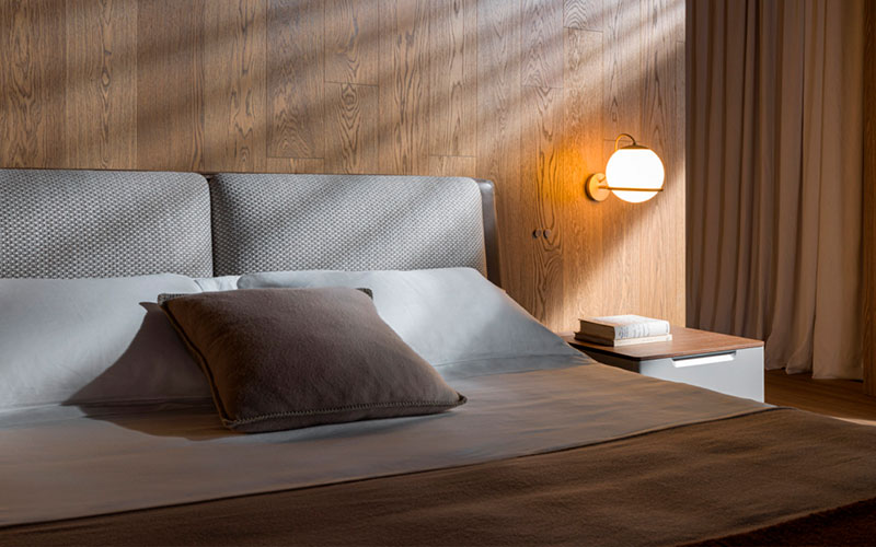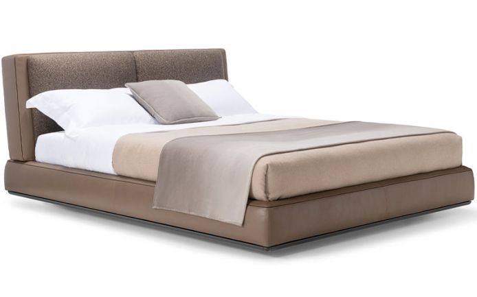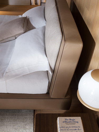 Molteni&C broadens its range of beds with a sophisticated and elegant proposal by Rodolfo Dordoni. The cooperation with the Milanese designer has led to Aldgate, a bed conceived as an island devoted to rest and relaxation. Designed as an isolated element, totally autonomous and self-sufficient, able to fit in with all kinds of bedroom furniture, Aldgate presents carefully designed details and soft, delicate and snug lines. Its heart is a container with rounded edges, upholstered in textiles or in leather and with sartorial finishes, embellished by a surrounding pewter colour frame that incorporates the bed, which can be positioned at different heights, and the rectangular backrest that recalls a monumental access road to the city. That too is rounded and it features two comfy cushions to lean back on. A bench to be placed at the foot of the bed completes the project.