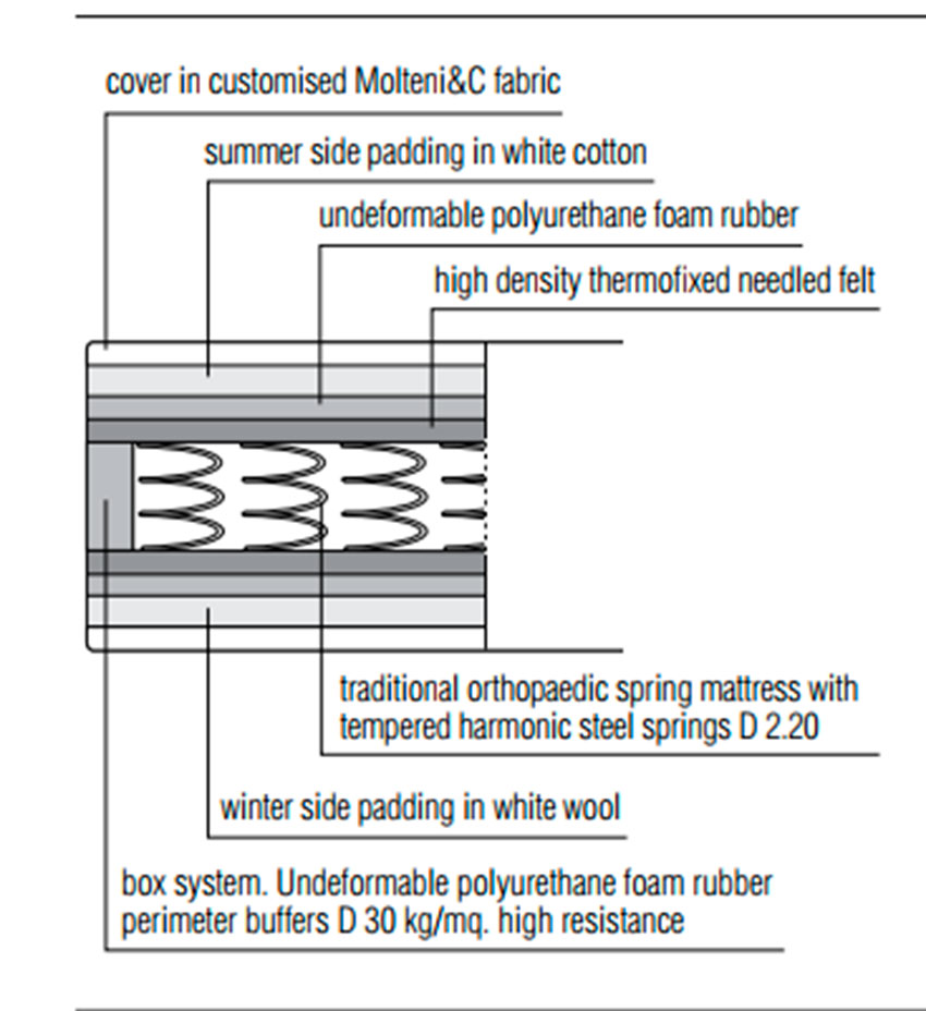 Structure in solid spruce (Picea Abies) and medium density fibreboard panels. Polyurethane foam padding with high bearing capacity.