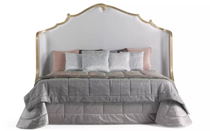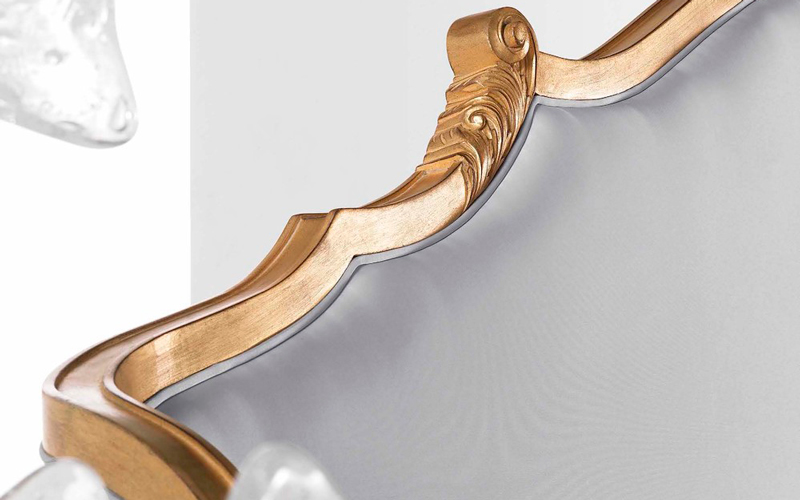 Annecy bed: a scenographic piece of furniture, designed to be the protagonist of the night area and characterized by an antique gold frame and a precious and refined light-grey satin upholstery.