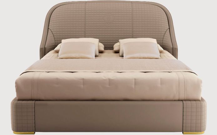 Solid wood and plywood structure. Quilted leather bed header and bed frame. Metal details. Multiple densities polyurethane foam padding. Wooden slat included. Available in queen and king size.