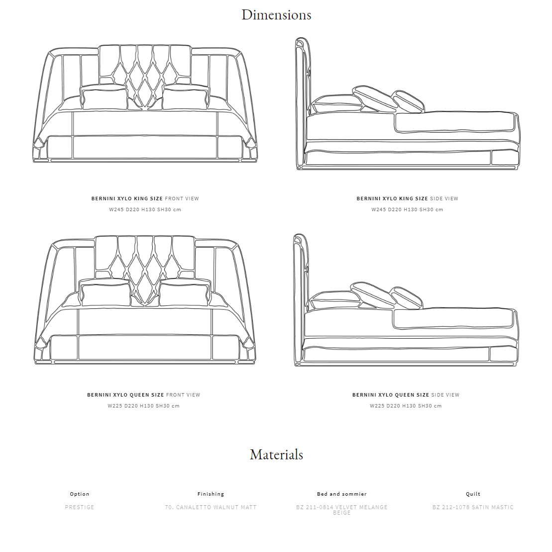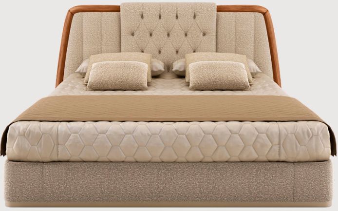 Solid wood and plywood structure. Bed header quilted with capitonné and vertical bands decorations. Canaletto walnut wooden header profile and base. Multiple densities polyurethane foam padding. Wooden slat included. Available in queen and king size.