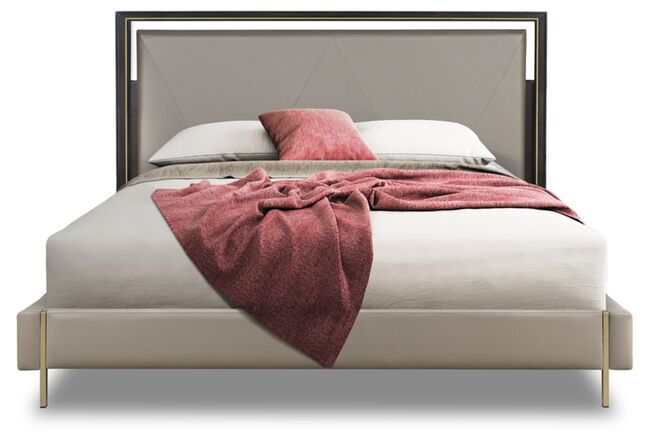 The bed is made in a modern style. The headboard and base are upholstered in fabric from the factory's assortment. The headboard is decorated with diamond-shaped decorative stitching.