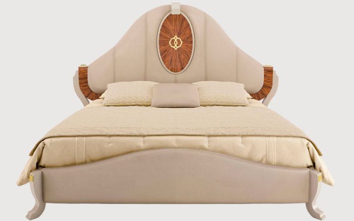 Shaped solid wood and plywood structure. Available in palisander veneer. Bed header and bed frame padded in multiple densities polyurethane foam. Brass details. Wooden slat included. Available in queen and king size.