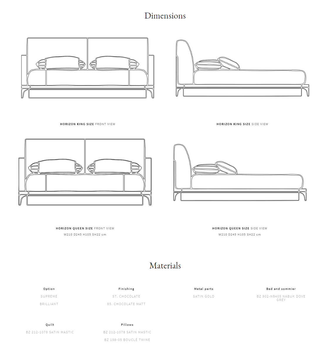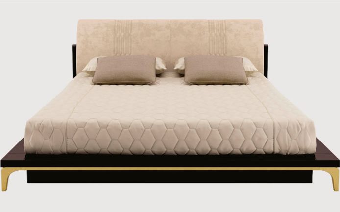 Solid wood and curved plywood structure. Quilted bed header. Satin metal feet and base. Multiple densities polyurethane foam padding. Wooden slat included. Available in queen and king size.