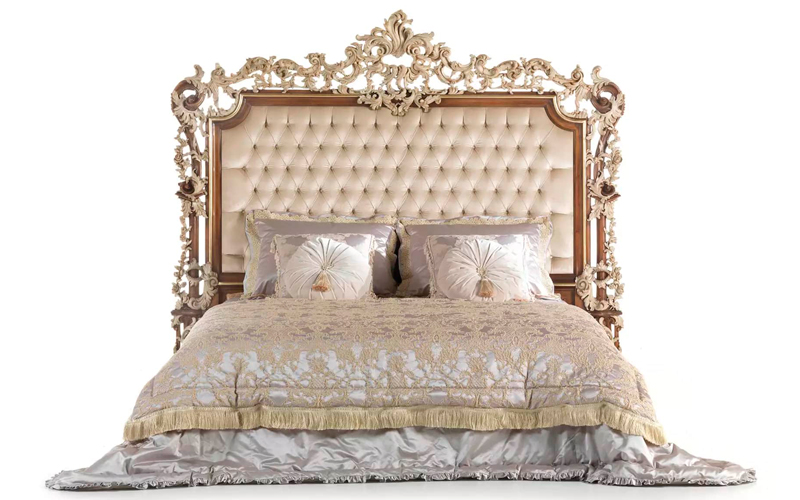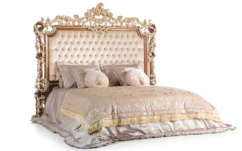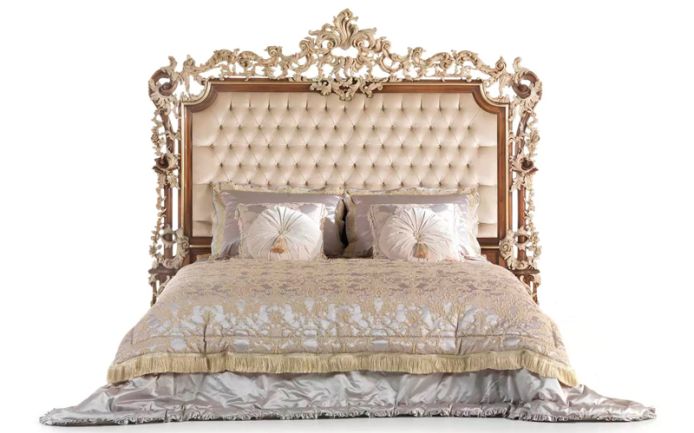 The majestic elegance of the rococo style in a refined line of furnishings that represents a real tribute to the most authentic classic style. The bed of La Grand Dame collection features a headboard with hand-made carvings with finishing in walnut and patinated white and gold and precious capitonné upholstery.