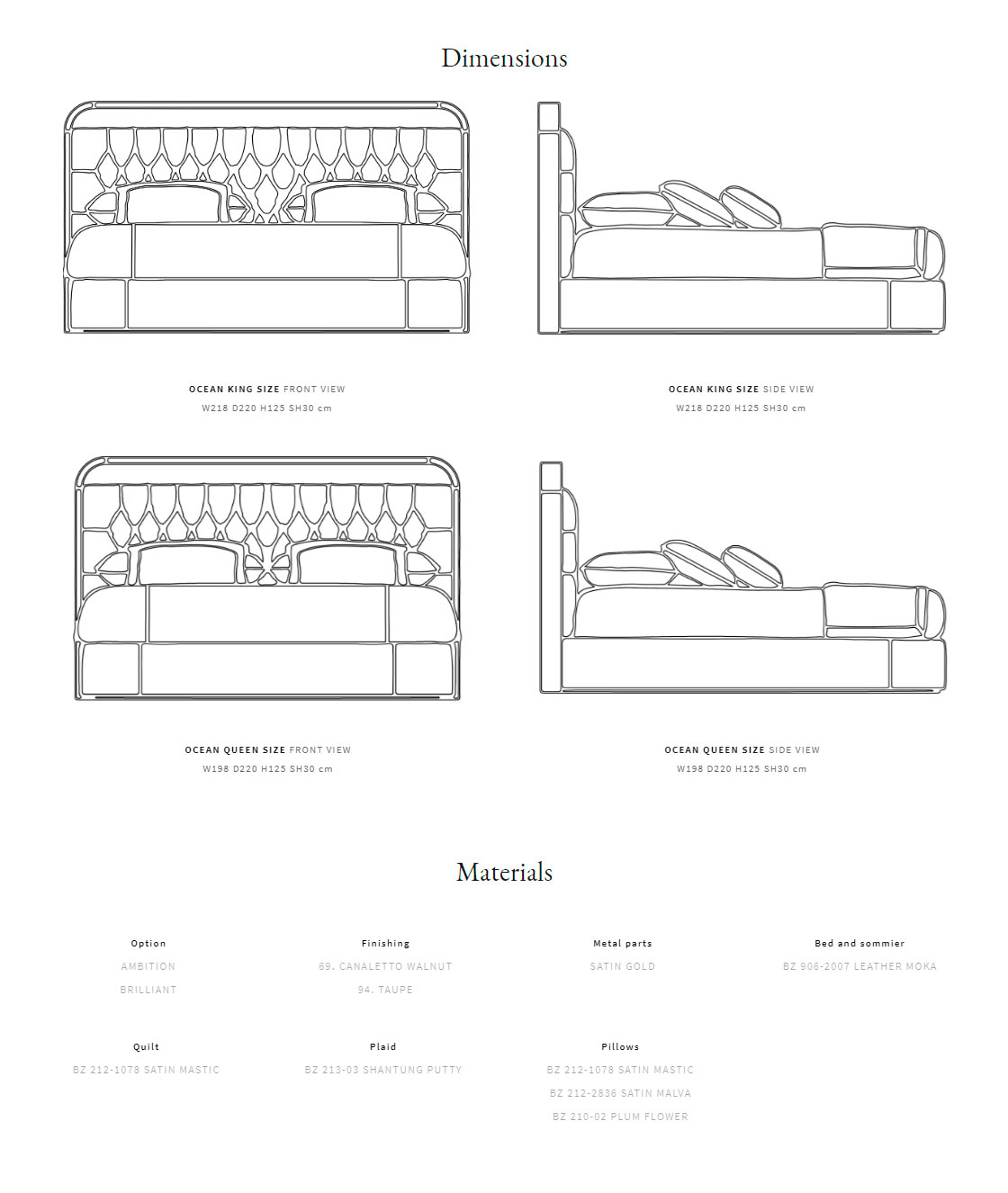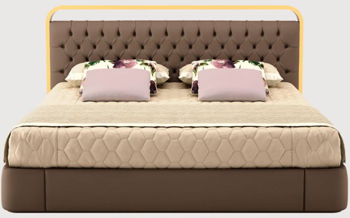 Solid wood and plywood structure. Capitonné bed header. Canaletto walnut wooden bed header profile, with metal satin decoration. Multiple densities polyurethane foam padding. Wooden slat included. Available in queen and king size. Bed set available on request.