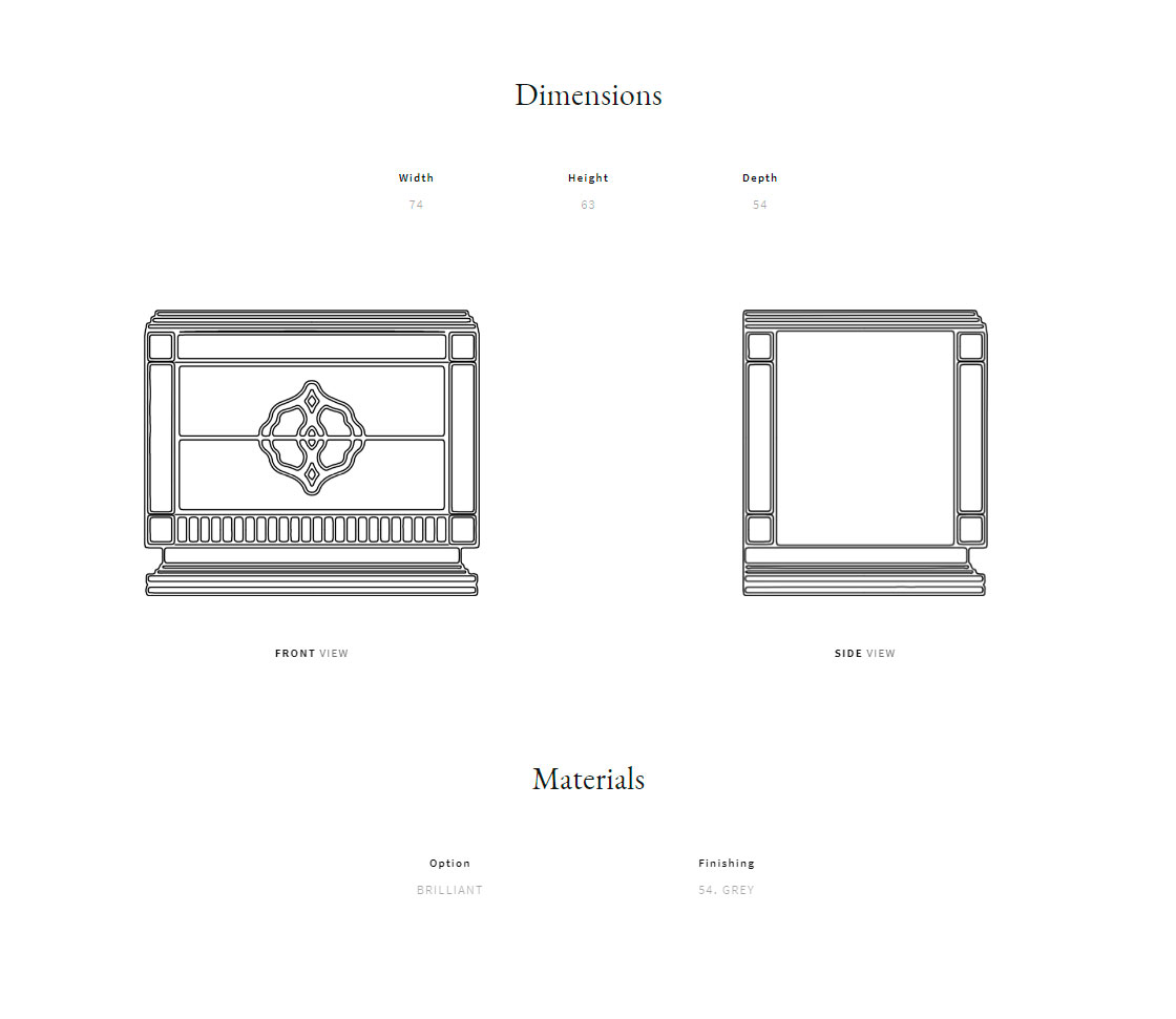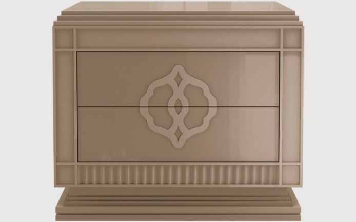 Solid wood, plywood and MDF structure. Drawers with low relief decoration. Available in lacquered wood.