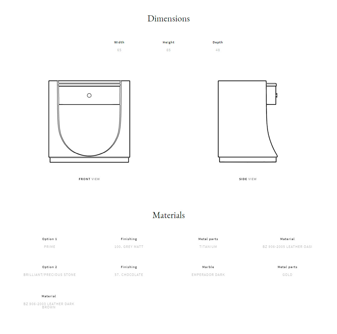 Curved plywood and solid wood structure. Quilted leather outer structure. Internal padded in leather. Top available in lacquered wood or marble.