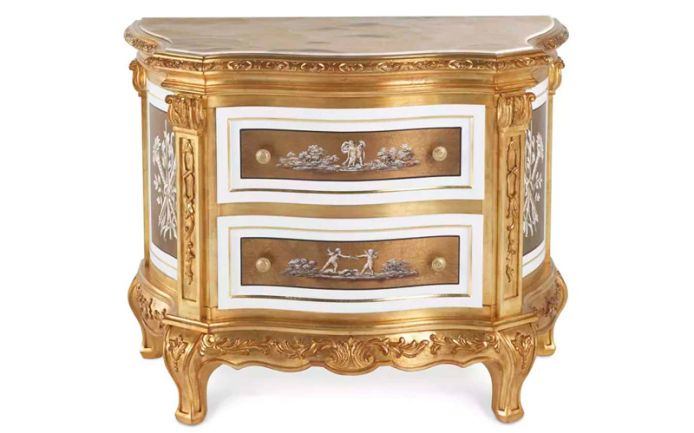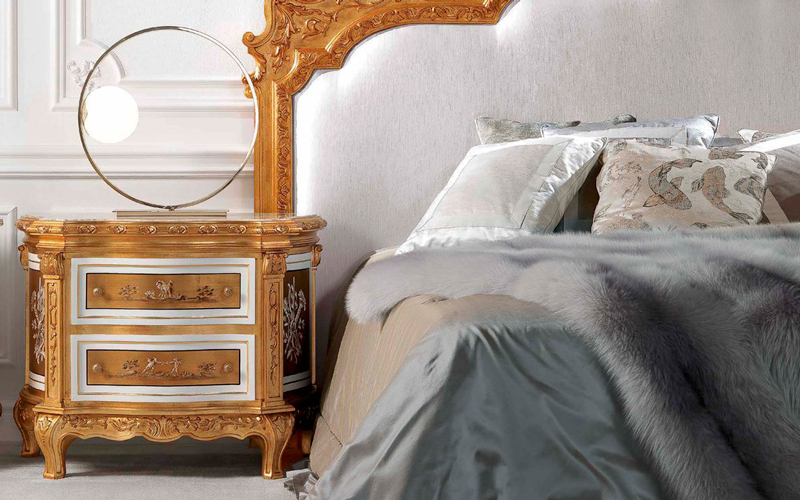 A line of furnishings in Baroque style, perfect expression of Jumbo Collection’ decorative spirit and craftsmanship heritage. The night tables of the line are characterized by a beechwood structure, with low-relief carvings finished in antique gold leaf with white and gold decorations inspired by neoclassical tradition, while the top is in precious onyx.