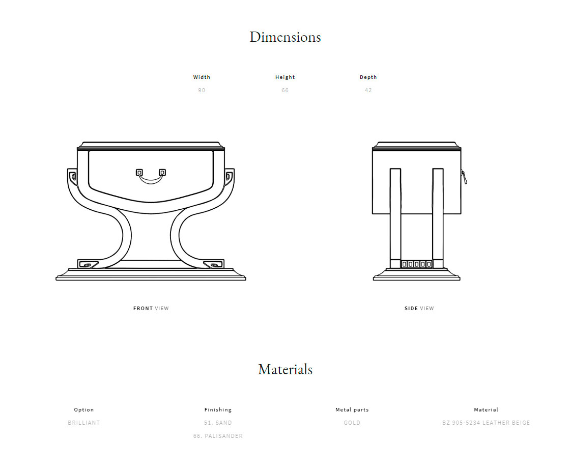 Solid wood, curved plywood and MDF structure. Available in palisander veneer. Front drawer padded in leather. Metal handle.