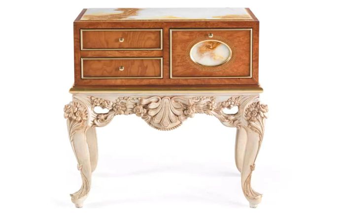 Elegant, luxurious and timeless, La Grande Dame furniture line is a tribute to the most authentic classic style. The night tables of the line are characterized by a precious hand-carved beechwood base in Louis XV style with finish in walnut and patinated white and gold. The structure is in walnut with brass inlays and marble inserts, like the top.