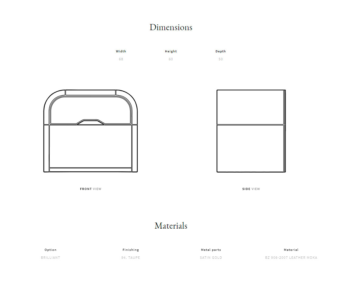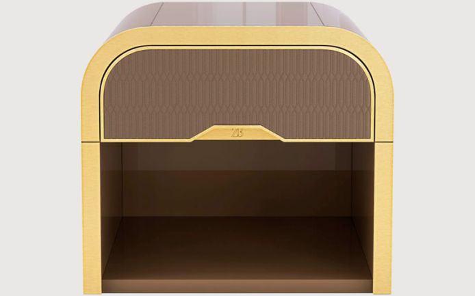 Satin metal and curved plywood structure. Available in lacquered wood. Front drawer padded in quilted leather.