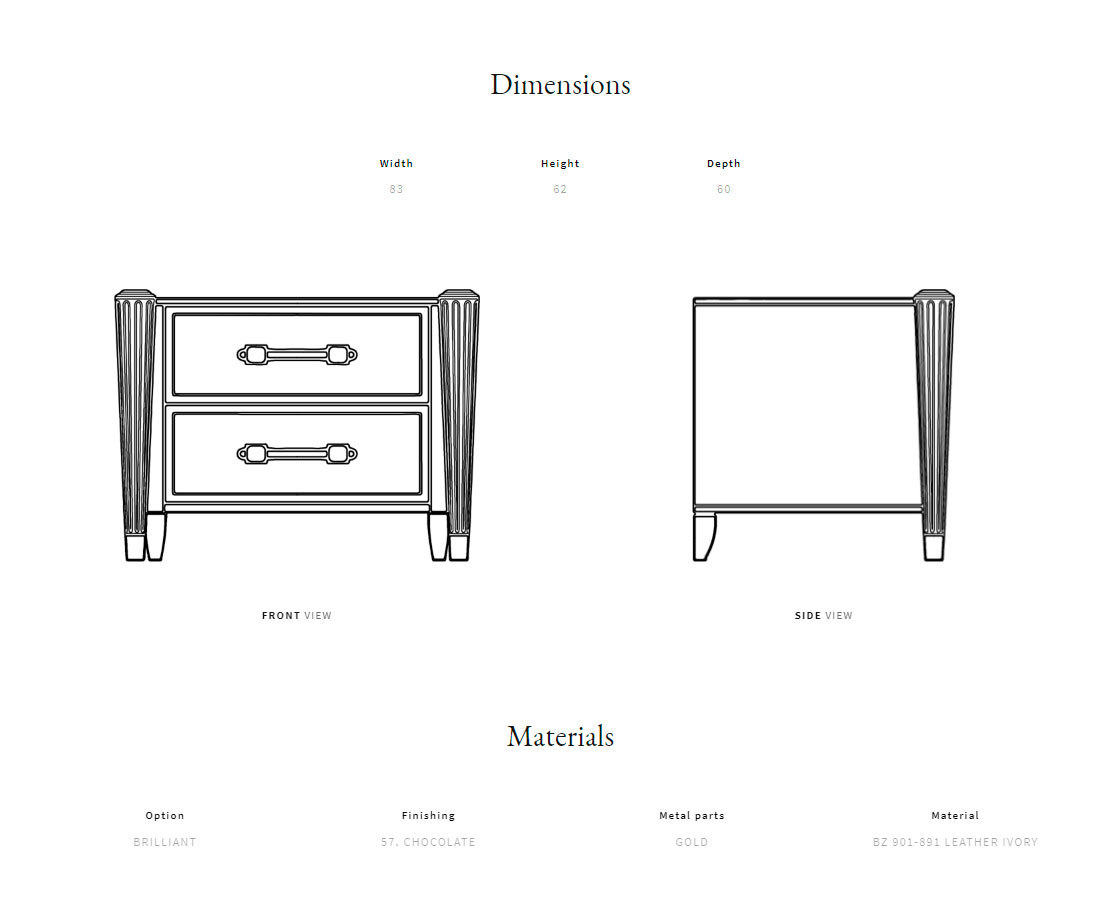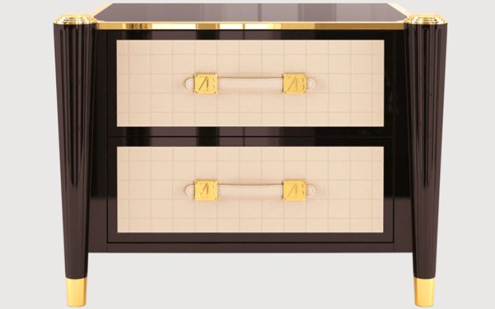 Solid wood, plywood and MDF structure. Lacquered wooden top. Quilted leather side parts and drawers. Brass handles and details. Wooden columns with fluted decorations.