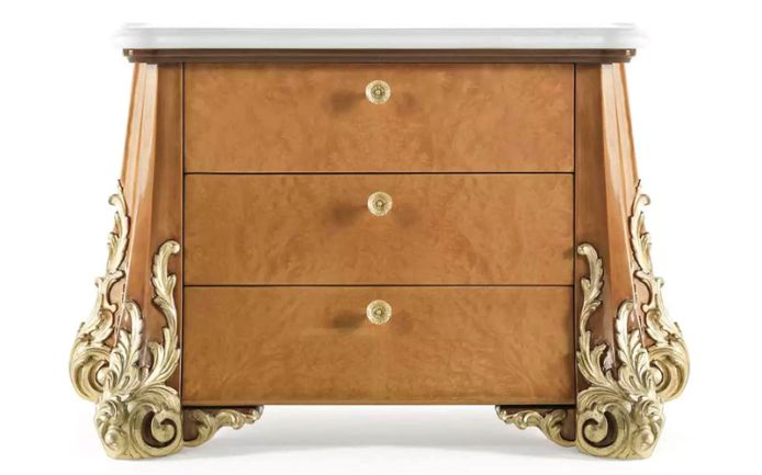 Sophie is a line of furniture with classical and sinuous lines. Featuring a wood structure with glossy briar finishing, the night tables of the line are enriched with hand-carved decorations and gold details that add a touch of timeless beauty to the entire setting.
