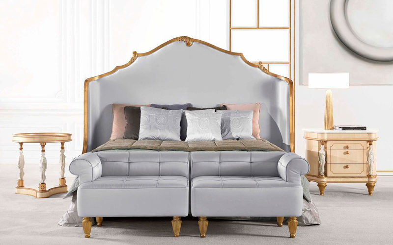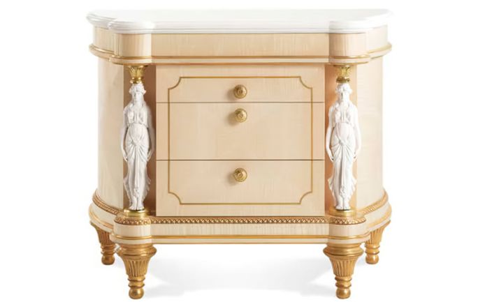 Elegant and graceful, Torchon is a Louis XIV style night table, with base in brass, maple structure and top in decorated leather. A perfect support base for lamps, books and magazines, it enhances the setting with style and delicacy.